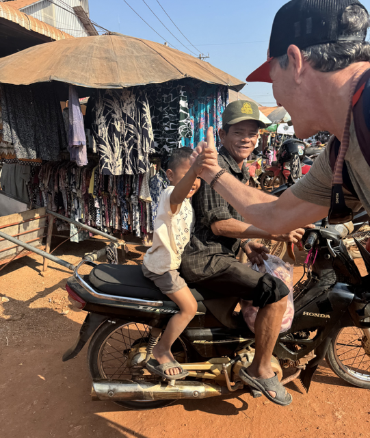 Pat, of course, took an interest in a treat and was given a whole bag. Turns out it wasn’t such a treat to our western taste buds, but he now had a bag of not just one kind, but also a second. What to do? As we left, he made friends for life with a small boy on the back of his dad’s scooter by handing over the treats.
