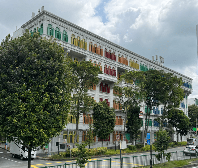 This gorgeous building is the police building. The Old Hill Street Police Station (now known as the MICA Building), home to the Ministry of Communications and Information and the Ministry of Culture, Community and Youth, is a colonial landmark located at the junction of River Valley Road and Hill Street. It officially opened in 1934, and was the largest government building in Singapore at the time. The building has a total of 927 windows that have been painted in shades of rainbow colours. The main courtyard has been converted into an air-conditioned atrium, and is sheltered by a 29-metre-high glass roof. It had a dark history as it fought the Chinese secret societies gaining traction at the time of its building. Now – the arts.