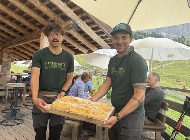 Today set the tone for the rest of the week. We hiked from the gondola drop off across the mountains to a lunch at a rifugio – an alpine hut that was one of a series across these mountains. The scenery was just a start – we couldn’t believe how beautiful it was. Seemingly inaccessible, even if a gondola went up, we had the most incredible lunches every single day. A huge variety from which to choose, plates of salad, bread, meats and cheeses promptly put out to greet us to get us warmed up for whatever we wanted from the menu. Really? Astonishing amounts of incredible food. Today’s specialty was the Apple Strudel. It set the tone for Rick – needing to assess apple strudel in every rifugio. This first one set the high bar. Here’s Luca and Martin holding it up for demo before cutting in.