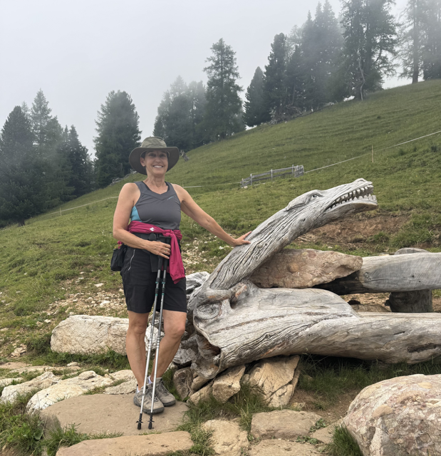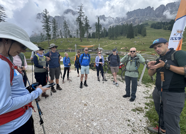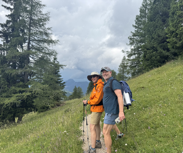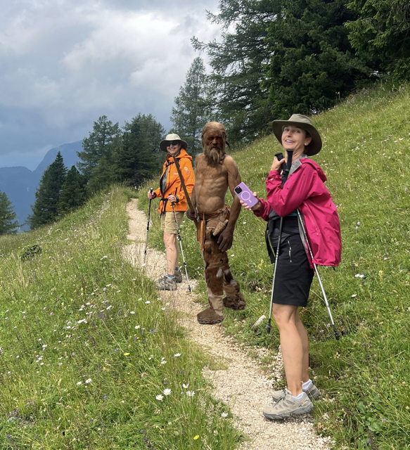 And now – to the hiking. We had our first experience of the mountains. It was a bit rainy, but not enough to deter us (and so much better than the torrential rain predicted) and the group was such a congenial group, there was a lot of chatting and exclaiming together. The hike went very quickly both before and after lunch. Matthew made sure the Ötzi joined us on many days!