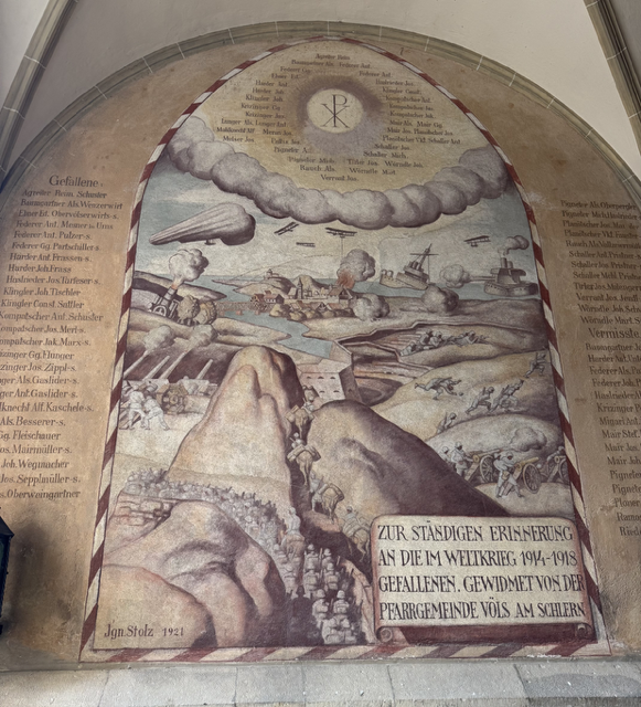 Outside monuments were interesting. This one was to WWI and was painted in 1921. This was on the wall of the church entry.