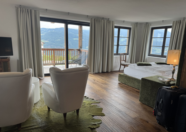 We arrived at our hotel and oh, so much fun, right up my alley. It was a historic building, a tower, built in the 1200’s. The Romantik Hotel Turm was originally a residential tower, first mentioned as a courthouse tower and jail in a document in 1244. Sold to a Monastery in 1398,. Used from 1820-1833 as a vacation resident by a Bolzano family. It was converted to an inn with attaché butcher shop i the late 19th century. [The rooms were so individual, a few of us traded looks just to see what had been done. They were really big and every one had spectacular views. It didn’t matter which direction you looked, it was beautiful.