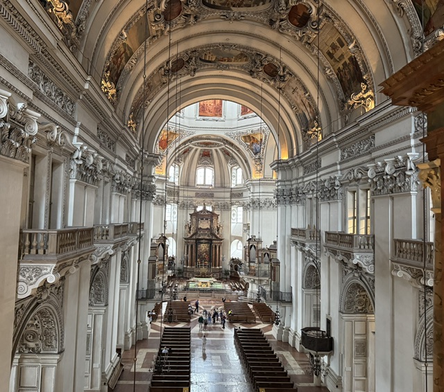 With the card, we went to Mozart’s museum, I loved it again and Rick thought it was great. Then to the Domquartier Residenz of the Prince-Archbishops showing over 1300 years of history. Crazy huge and I hadn’t seen before. It went through halls from the Residenz of the Archbishop, to the Cathedral, to St Peter’s church, and carried on. I, of course, was completely turned around since we were inside and walked connector to connector just as the archbishop and the higher ups would have back in the day. But it was remarkable and huge. I started speeding past a lot, but different parts caught my interest. As in the Middle Ages Mideaval approach to Mary as noted above. We did see the Cathedral from the organist’s viewpoint.