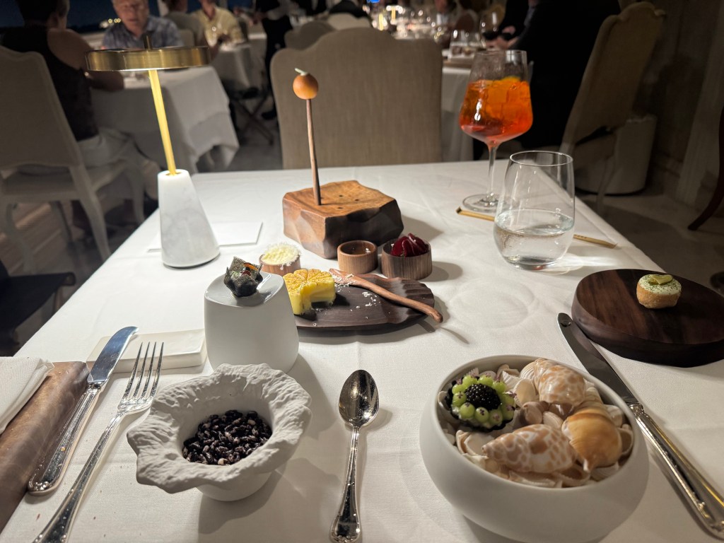 Turns out the restaurant here is a Michelin rated restaurant and I just wanted a snack. So I did get a snack (crazy amazing pea appetizer), and despite the fact that I was only ordering an app, they brought me an amuse-bouche that had 5 parts to it! Crazy and such a treat, each bite perfect and different. Yes, even that little ball on the skewer is one of them.