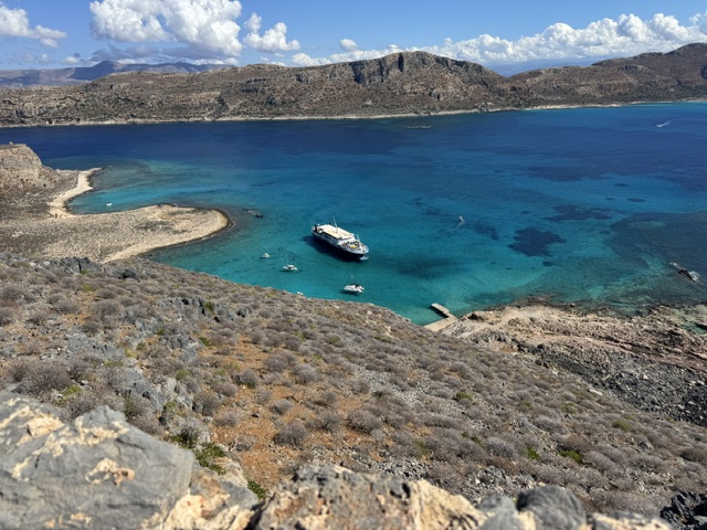 Below is our catamaran from the top of Fort Gramvousa – I’ll write about that in a bit. Our boat felt quite sizable when we were on it, but next to the ferry pulling in and unloading a ton of people, we look tiny. Rick and I climbed up, but Kaz and Eli wanted all the swim time possible. The water is wonderful with so many different hues of blue.