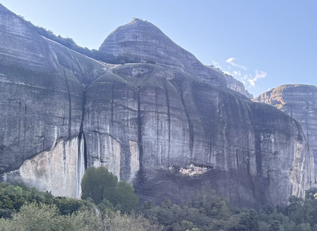 The word Meteor means suspended in the sky. There used to be 24 monasteries on the top of these mountains. Now there are 6 and 2 of them are converted to convents. They didn’t have enough monks who wanted to live a secluded life, so the archbishop converted 2. The ascetics (word derived from asceccsis sp?) meaning exercise, mind, body, etc. They started in the caves here in the 12th century. They would come down periodically for services and to get what they needed to survive in the caves.