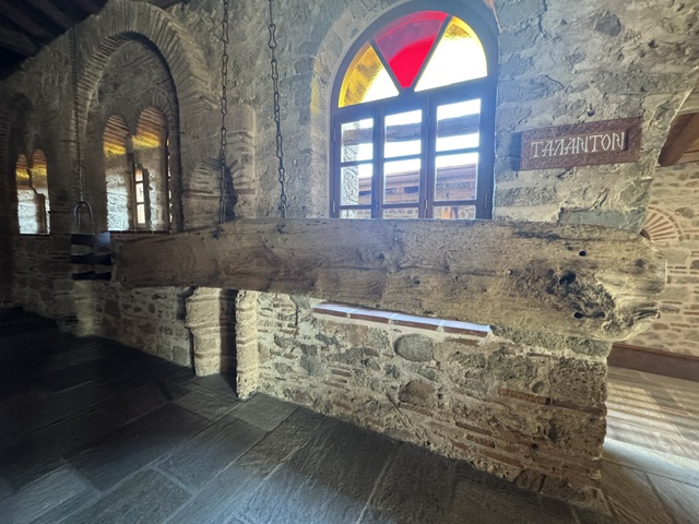 During Ottoman times people could practice, but not make a loud noise about it. Literally. So no bells to call people to service. Instead, the monks made this long wooden plan to hit with a mallet and it gave different signals depending on where and how it was tapped. In addition, to the left was a small chime that could be used for the main services to call the monks.