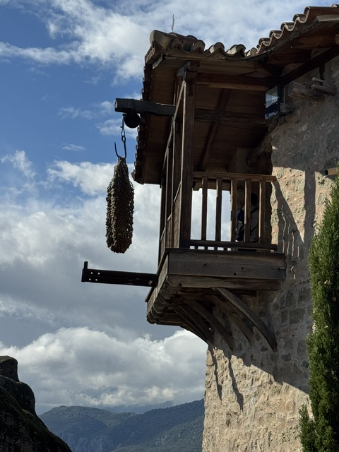 Our first stop was the Holy Monastery of the Transfiguration. It was started by the Saint Athanasios the Meteoritis in the middle of the 14th century. He set down the rules by which the community was to live in this first monastery and all other monasteries followed these guidelines. He started in a cave and gradually others came to practice and study with him and the monastery grew. The Blessed Athanasios (he’s been sainted) wrote/said? “I place you under the roof of the Blessed Virgin Mary which is the purpose of this monastery.” He was succeeded by a prince who became a monk under his guidance, who built up the monastery closer to what it is today, named in honor of the Transfiguration of Christ. The skulls of both these monkeys are saved here and honored on the 20th of April every year. Now the monastery looks huge, but only 3 monks inhabit it. However, there’s considerable space for Greek Orthodox who want to go on retreat short or long, now both men and women can be there. The way up and down was by net and baskets. Incredible. Now – we can walk up carved and built stairs – otherwise I definitely wouldn’t have seen it.