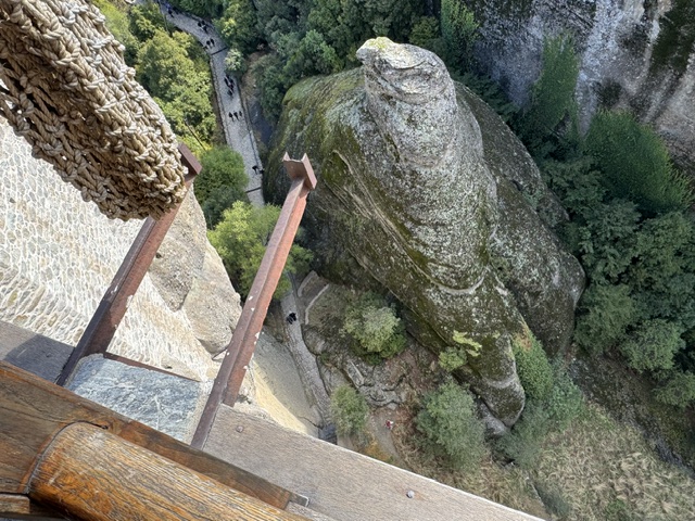 We then stopped at the Monastery of Holy Trinity. This was a higher climb so fewer tourists go, and again we were grateful that we were traveling now and not earlier in the summer when there were so many tourists, it was hard to see anything. This monastery still had the net hanging outside showing where transportation happened. It’s hanging off the wooden balcony about mid-way up the building. Straight down. I did NOT go near to look down, but Eli C took photos for me. This monastery also currently has 3 monks. They transport both here and at the main biggest monastery via a small cart that crosses on wires – looked totally sketch, but definitely easier to get groceries in!