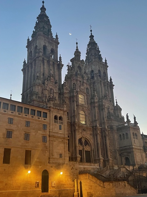 I don’t know why, but I assumed that the old beautiful villages would be done when we left Santiago, but no. I’ve included a video of one we walked through about an hour outside of Santiago. But first – night time, early morning with the moon and then distant view of the cathedral at sunrise. Just a magical edifice.