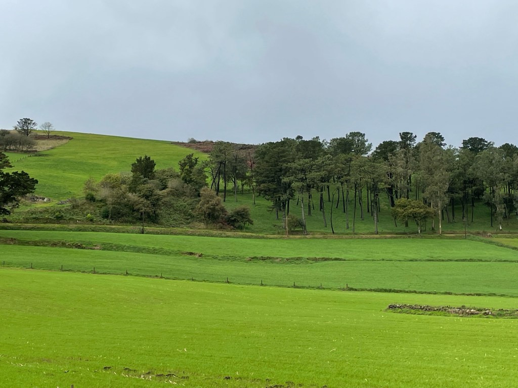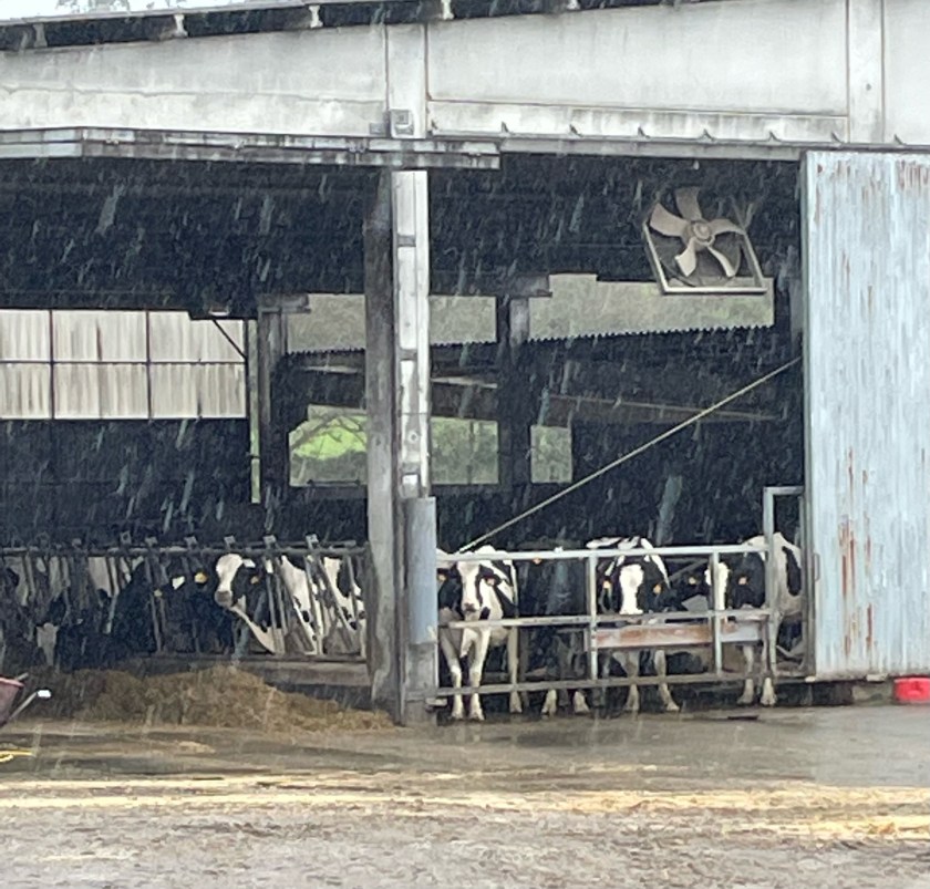 We had just the right clothes, stayed dry enough and warm enough and it was a day dreamy kind of day. At the end, I started getting pretty tired and Kylie saved me with her “mom’s playlist.” Rick wondered why I was suddenly walking so much more quickly and it was fun! Singing aloud – no one could hear – and dancing a little with great bluegrass moments, just fun. Many dairies of different sizes and styles. So here’s the green, the cows, and a small cat that jumped into my pack as I was getting into my rain pants.