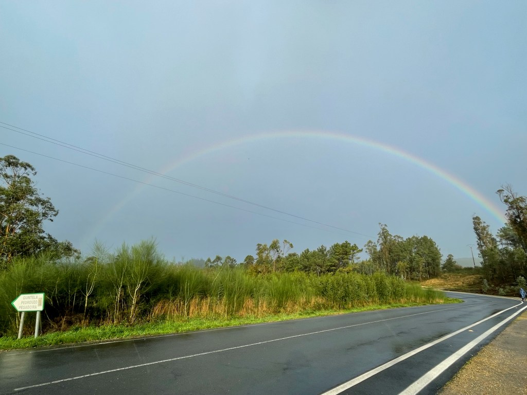 Well, we debated a bit about whether to do the full 21 miles, but decided to stay with the arrangements I’d made back when I booked. I was told many do the transfer and it worked out great. We took a taxi to our start point and it started to really rain. Maybe 3 moments of sun, 1 rainbow, and the rest was rain, pouring rain, rain with wind, wind, back to just rain and it was great. Truly.