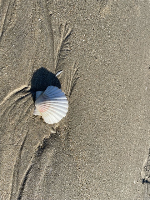 I walked onto the beach – what a wonderful way to finish the Camino. I talked with a Swedish woman (Rick had stayed on the real path to save his ankle), she and I had both started in St. Jean. She felt the same as I did, we had completely loved the journey and there were more Caminos in our future. She was collecting scallops to bring home. I hadn’t thought of that, but had already taken this photo of front and back of a scallop. It still had it’s animal, so didn’t collect. I collected after. All these scallop shells! Maybe St. James really did fall into the water and come out covered with scallop shells.