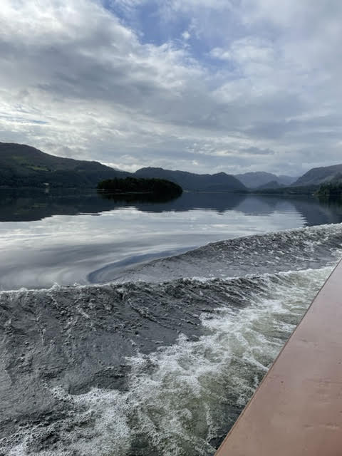 Well, today was our last day hiking here and it was another amazing day of 8 miles. Best breakfast of the week at our B&B and last night was a wonderfully cool quiet night. We walked down from our B&B after breakfast to the ferry to go to the other side of Derwentwater to climb Cat Bells – opposite the crag we climbed yesterday. The photo shows our wake in an incredibly glassy calm lake. Such a nice way to get to your hike!