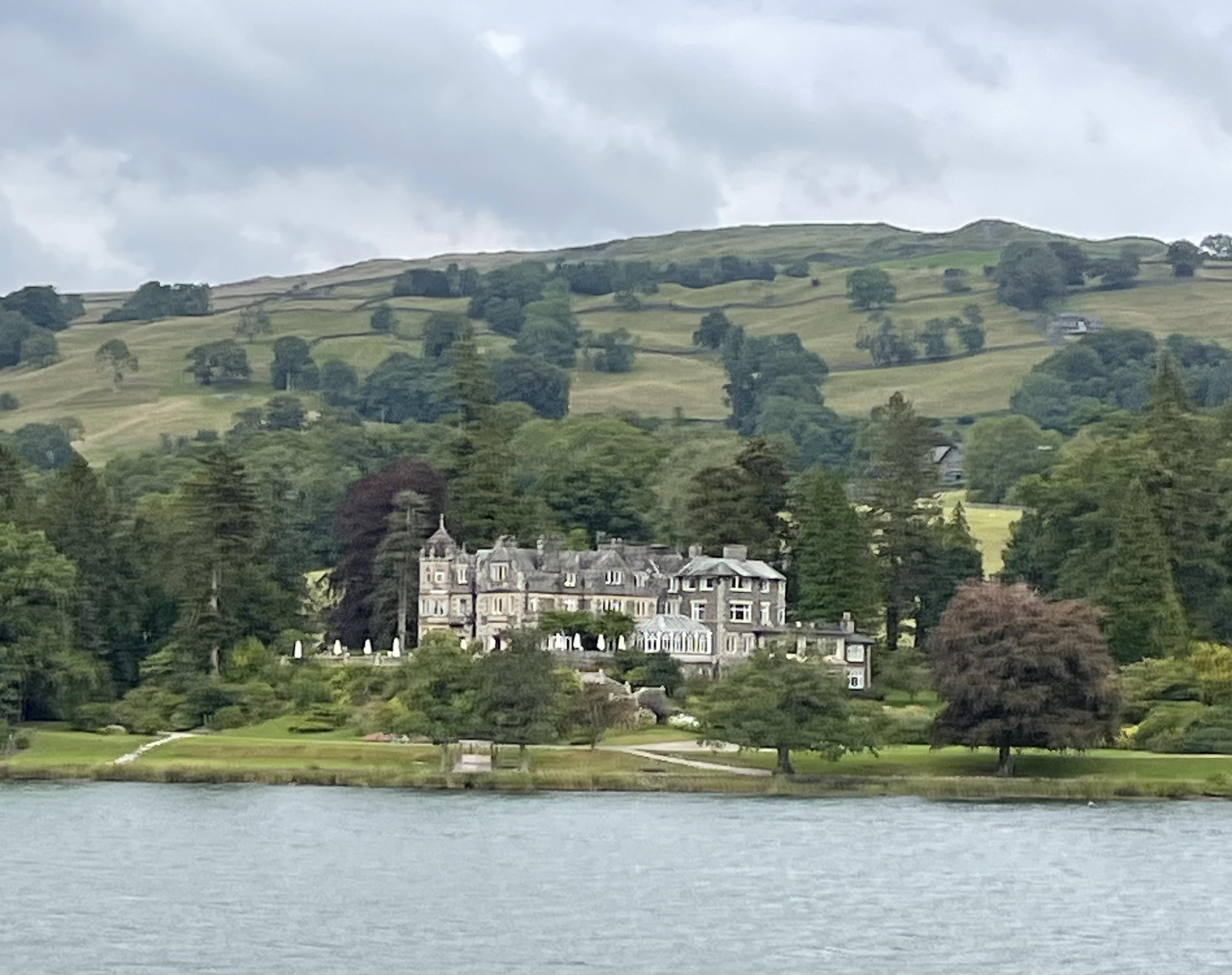 Back to a second ferry that was a car ferry and actually used a pulley system and pulled the ferry back and forth with cables. Walked another 15 minutes to a third ferry which was the best yet. Nice wooden benches on top, the rain had stopped for a bit and we came all the way back up Windermere seeing amazing old stone mansions on the shore and in the hills. Most of which are now hotels and inns.
