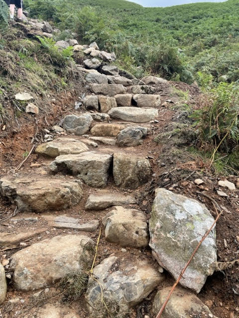 Here we can see them starting to build another path alongside a run off bed that is the current path. Helicopters carefully deposited these bags, at least 3 times as long a line up as what you can see here, snaking down the hill. And see the ferns? We realized that’s what’s blanketing all the hillsides – not bushes, but incredible banks of giant ferns!