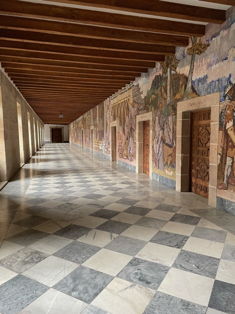 In 1953 a new hospital opened up and all of the patients and medical staff moved to the new facility. As soon as they moved, the National Institute of Industry (under Franco) got started. In 9 months, working 24 hours a day, they pulled down and rebuilt 22,000 square meters of roofs, 12,000 m2 of stone walls erected, 12 hectares of walls painted, and 20,000 m2 underground prepared, and more. A lot more. They worked “even on Sundays.” The hotel opened on July 24, 1954, on the eve of St. James Day.