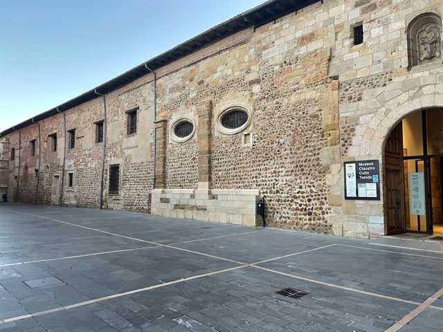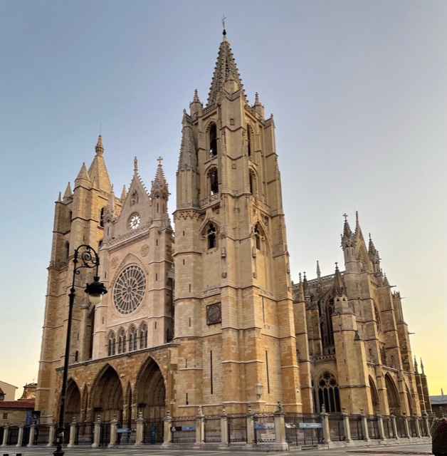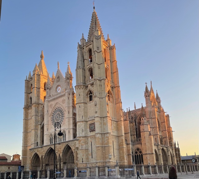 I walked all the way around the Cathedral of Leon, seeing ancient walls and then the cloister. An older woman was walking into the cloister and told me a service would be at 9am, before it officially opened. I reconfirmed I heard right and went to have a hot chocolate and croissant while I waited. Then the sun hit the cathedral as I watched and the stone shifted in color.