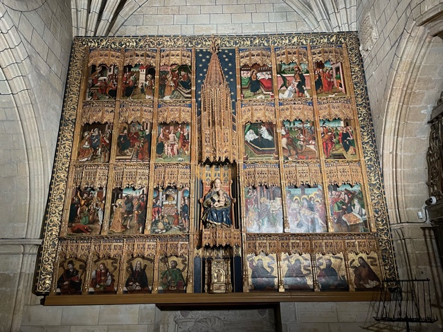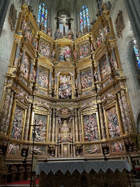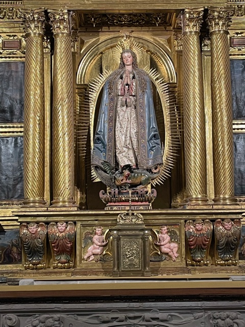 It was begun in 1471 and most of the work was done in the 1500’s. It was described as German gothic and it was a heavier feeling place than Leon. I was mostly interested in the different depictions of Mary. This is the main altar and was done byGaspar Becerra in the 1500’s – described as the Michelangelo of Spain. My book says this retablo mayer (display behind the altar) is one of the best Renaissance ensembles on the Road – it really is monumental.
