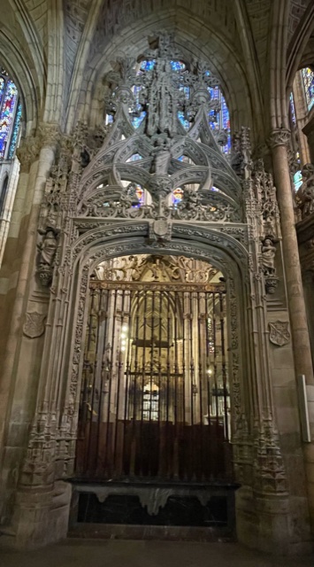 This is in one of the chapels behind the main alter. Then a closed gate with the chapel for “his holiness”. This is the chapel that’s part of the cloister, but turns out it’s also just off the cathedral. Interesting how it unfolds. My photos is taken from through the gate keeping people in the cathedral out. This chapel was built in the 1500’s so is “florid gothic”, but the lecturer didn’t seem to think it was too florid and I thought it was wonderful. Inside it is the container for the sacraments. When he opened it this morning, I thought it must be pure silver. Turns out, yup, the most valuable piece in the whole cathedral.