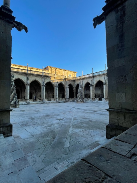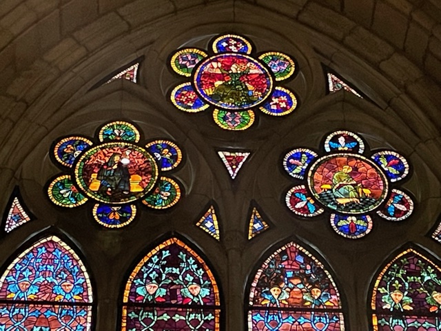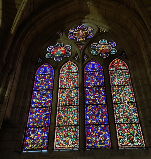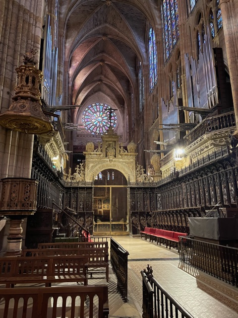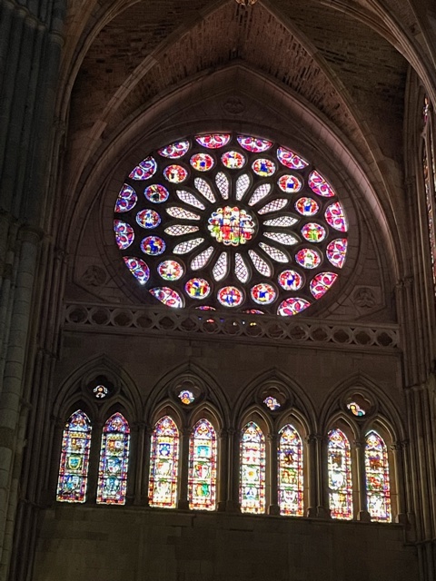 The cloister is right next to the cathedral. I hadn’t put it all together yesterday when we did the tour. But going through that arch at the back of the cathedral and round the cloister, then seeing through the chapel into the cathedral linked it for me. I decided to go back into the cathedral, listen to the tour again (in English!!!) and try to remember more details. I was able to get some photos without so many people and noise. Actually, just music for a bit, so nice. It’s the most beautiful church I’ve ever seen. The stained glass is just incredible. Some of the things I learned: