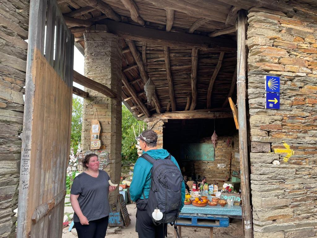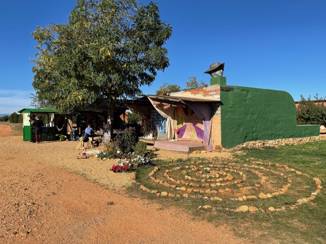 Below was a shot of a hippie like gathering, complete with a guy playing the guitar and a group sitting around on couches in this open area. Felt a little studied to me, but I also felt old! We just looked in and kept going on. Rick’s talking to Johanna who we’ve met a few times, so nice, taking her time walking the Camino. She’s the one who left our wonderful place a couple of nights ago at 5:30am and walked up in the dark through the woods. She moves slowly and wants a lot of time, but wow. She told us today she was worried about wolves. I’d be worried about getting lost and not seeing an arrow to point my way.