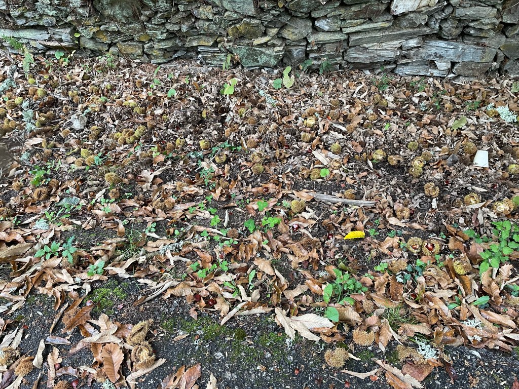 Here’s a photo of chestnuts on the ground – big around here and saw people parked by the side of the road picking up chestnuts. An ancient woman was stooping and reeeaaaccchhhinggg out to pick up one at a time. She had already filled one apron pocket and was still collecting. I couldn’t believe people just walked by without helping. So I started looking and realized you do have to be a bit picky, rich color, nothing eaten into it. I gave her one, was going to find more, but realized her hands were already full. Sweetest face, talked a lot and I didn’t understand but maybe 1 in 10 words, thick accent. So cool. I love this adventure.