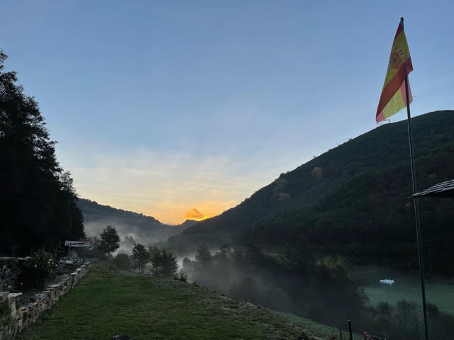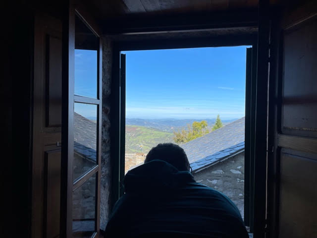 It was an easy day today, in to my hotel by 1:30 and such a sweet albergue. Just outside the town of Herrerias. I’m surrounded by green pastures, can hear both the river and the cow and sheep bells as well as the radio from the bar. Here’s a view from the balcony along the hotel.